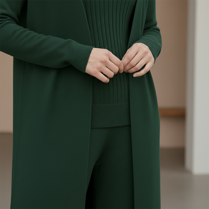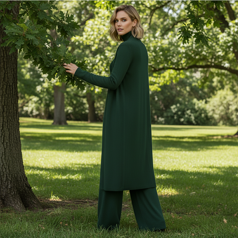 VLEIEND SILHOUET - Het lange vest en de wijde broek zorgen samen voor een slank en langgerekt silhouet. Dit ontwerp benadrukt op slimme wijze je natuurlijke vormen en zorgt voor een elegantere en gestroomlijndere look dan standaard casual sets.